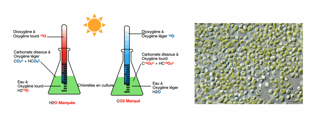 - A l’aide du document 1, expliquer de quelles molécules proviennent les atomes d’oxygène du O2 et des glucides produits par photosynthèse.
