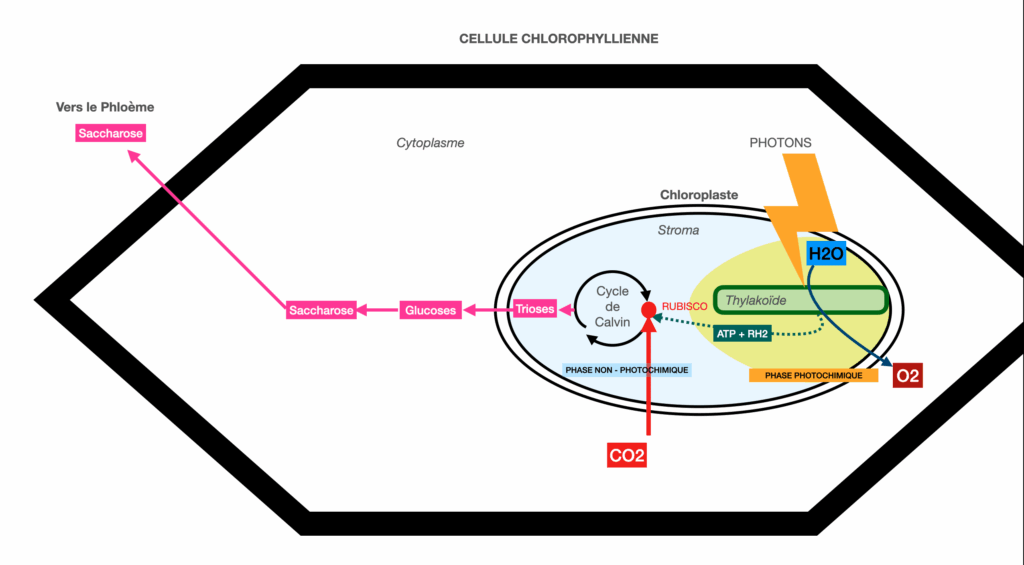 La phase non photochimique se déroule dans le stroma. Elle consiste en l’assimilation du CO2 grâce à un cycle mis en évidence par Melvin Calvin (d’où son nom, cycle de Calvin). Les sucres sont synthétisés à partir du dioxyde de carbone et de l’hydrogène apportés par le transporteur (ou accepteur d’électrons). Ce processus nécessite aussi de l’énergie ou ATP. L’enzyme clé de ce cycle est la Rubisco qui permet la fixation de 3 carbones par cycle, issus du CO2 absorbé. Cela permet d’obtenir un sucre à 3 carbones ou triose. Il faut donc faire tourner 2 fois le cycle pour obtenir un glucose qui est un sucre à 6 carbones.